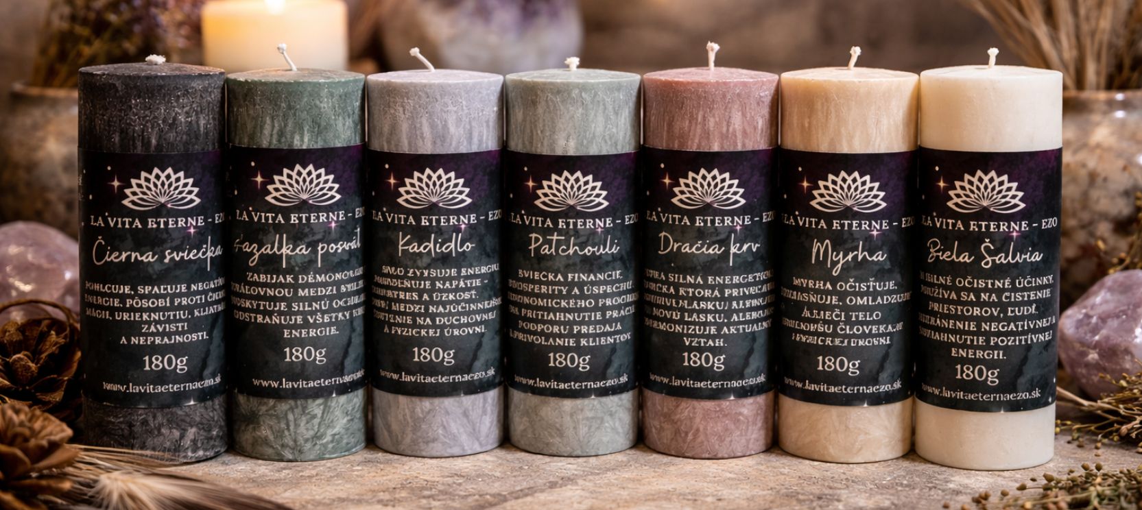 Každý produkt v našej ponuke vzniká s úctou k prírode, tradíciám a jemným energiám, ktoré nás obklopujú.Vyrábame očistné sviečky, náramky a ezo doplnky, ktoré nie sú len dekoráciou, ale nástrojom vedomej práce so sebou. Do každej sviečky starostlivo vyberáme prírodné zložky, minerály, bylinky a symbolické prvky tak, aby mala konkrétny účel, význam a energetický zmysel.Naše výrobky vznikajú ručne, pomaly a s jasným zámerom pre očistu, ochranu, harmóniu, nové začiatky či vnútorný pokoj. Veríme, že skutočná sila sa rodí v detailoch, kvalite a úprimnosti zámeru. Lavita Eterna Ezo je viac než e-shop.