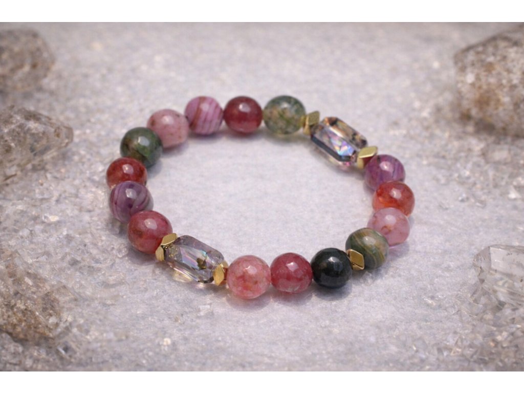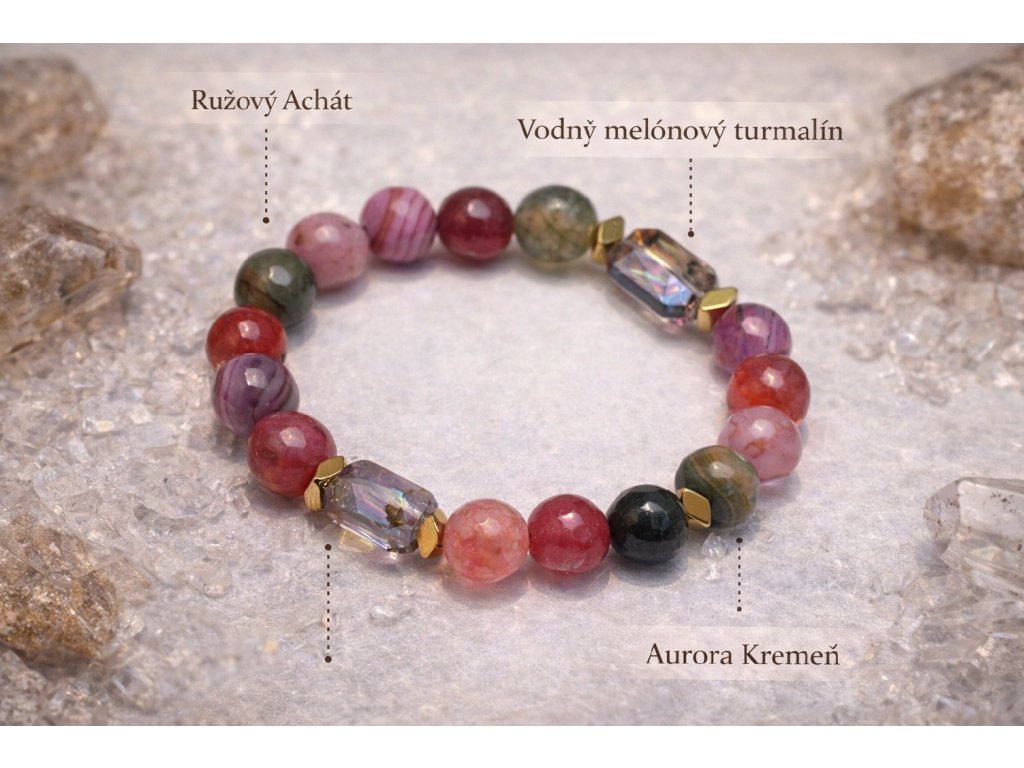 Náramok lásky, harmónie a jemnej ochrany – Ružový achát, Melónový turmalín, Aurora krištáľ